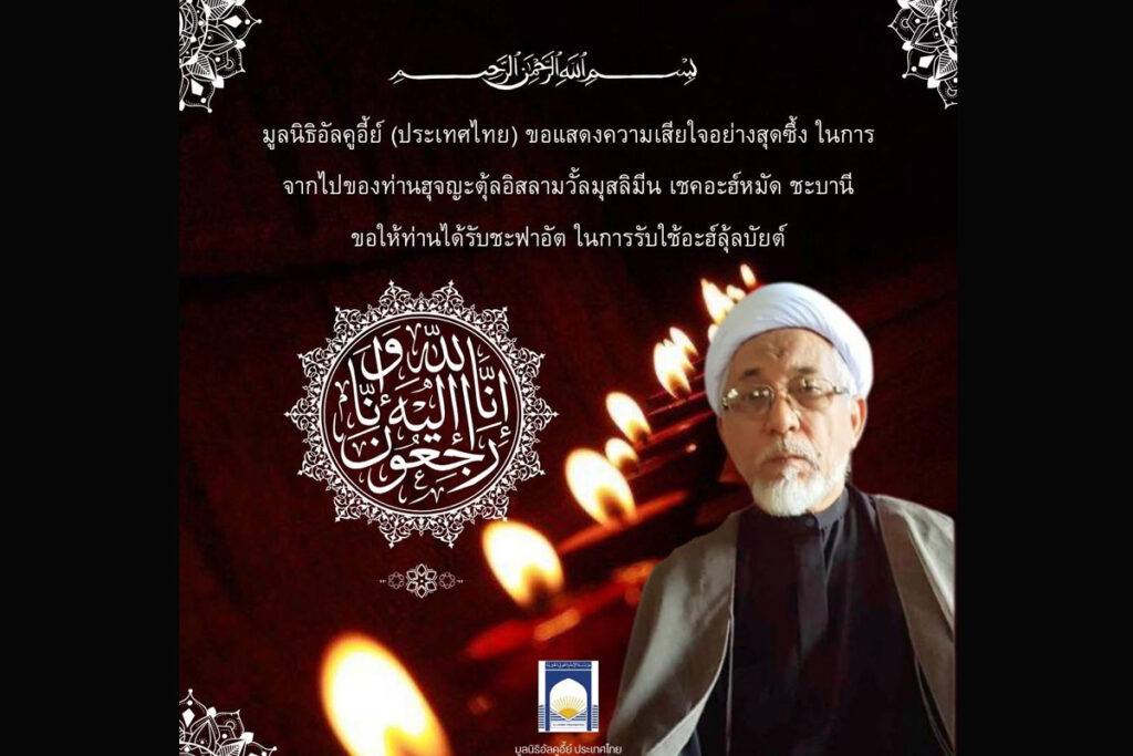 มูลนิธิอัลคูอี้ย์ (ประเทศไทย) ขอแสดงความเสียใจอย่างสุดซึ้ง ในการจากไปของท่านฮุจญะตุ้ลอิสลามวั้ลมุสลิมีน เชคอะฮ์หมัด ชะบานี ขอให้ท่านได้รับชะฟาอัต ในการรับใช้อะฮ์ลุ้ลบัยต์ เมื่อวันที่ 23 กรกฎาคม 2568