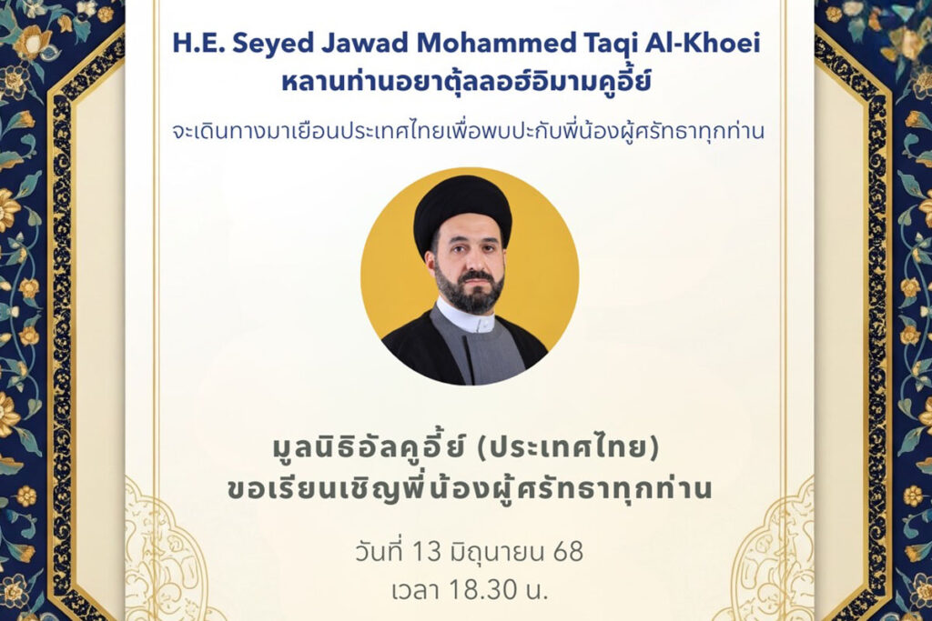 ด้วยความยินดีอย่างยิ่งที่ H.E. Seyed Jawad Mohammed Taqi Al-Khoei หลานท่านอยาตุ้ลลอฮ์อิมามคูอี้ย์ จะเดินทางมาเยือนประเทศไทย เพื่อพบปะกับพี่น้องผู้ศรัทธาทุกท่าน