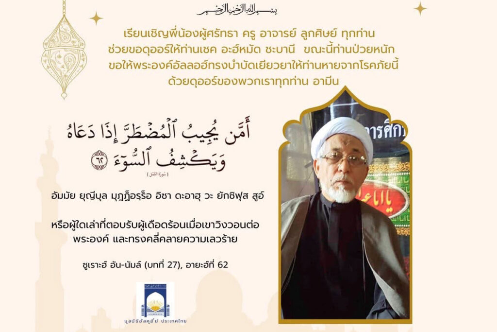 ประชาสัมพันธ์เรียนเชิญพี่น้องผู้ศรัทธา ครู อาจารย์ ลูกศิษย์ ทุกท่านช่วยขอดุออร์ให้ท่านเชคอะฮ์หมัด ชะบานี เรียนเชิญพี่น้องผู้ศ